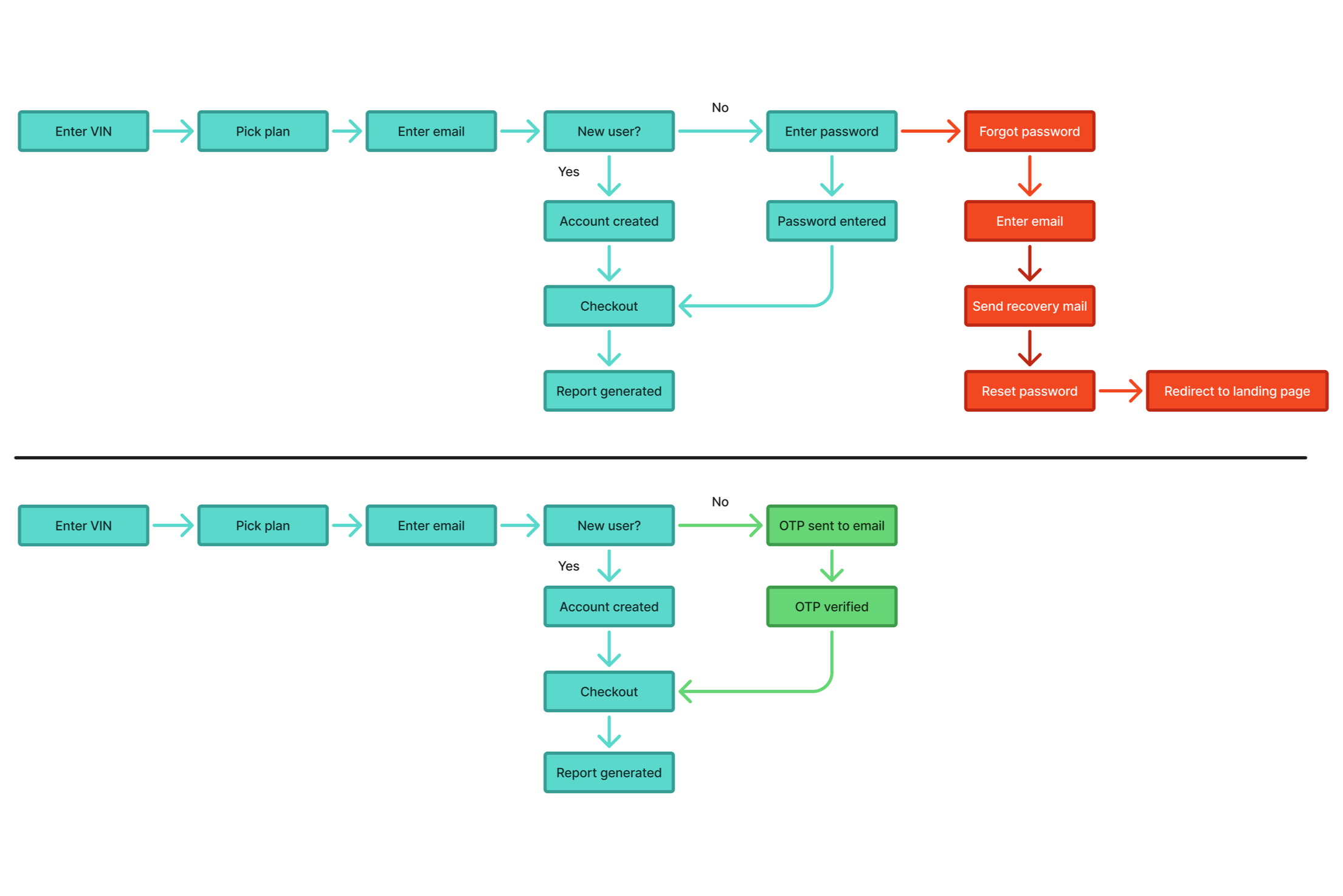 A separate issue involved the "I don't have VIN" button on the landing page. User testing showed most people expected it to help them find their VIN — not redirect them to a credits-only pricing page. I proposed removing the button and allowing users to proceed without a VIN, naturally routing them to credits. The fix was first implemented on the web — validating that the insight held beyond the context I originally raised it in.